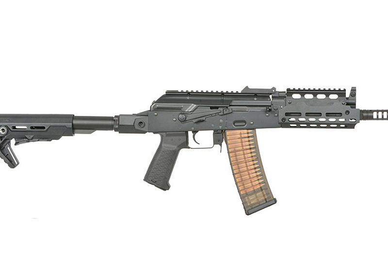 The AKS-74U replica is made from top-quality materials, ensuring durability and reliability. **Metal elements**, such as the stock guide, AR-15 stock adapter, receiver, bolt cover with RIS rail, selector, gas block, handguard, barrel, gas tube, gas block, sights, compensator, and trigger, ensure the solidity and longevity of the replica. Meanwhile, the stock and pistol grip are made from **durable polymer**, which enhances user comfort. **The replica is very well-fitted**, ensuring that all parts fit perfectly together, providing stability and confidence during use. Additionally, the M-lock handguard with RIS rail allows for easy attachment of accessories, such as grips, flashlights